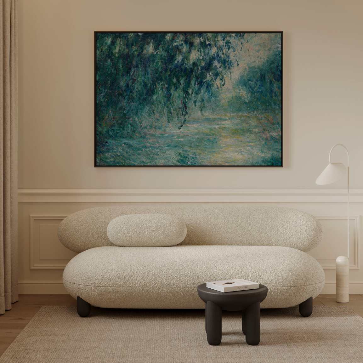 Ten obraz na płótnie w ramie przedstawia „Morning on the Seine” (1898) autorstwa Claude’a Moneta. Wczesne światło przenika przez mgłę, a powierzchnia rzeki odbija drzewa i niebo w miękkich, drgających tonach.