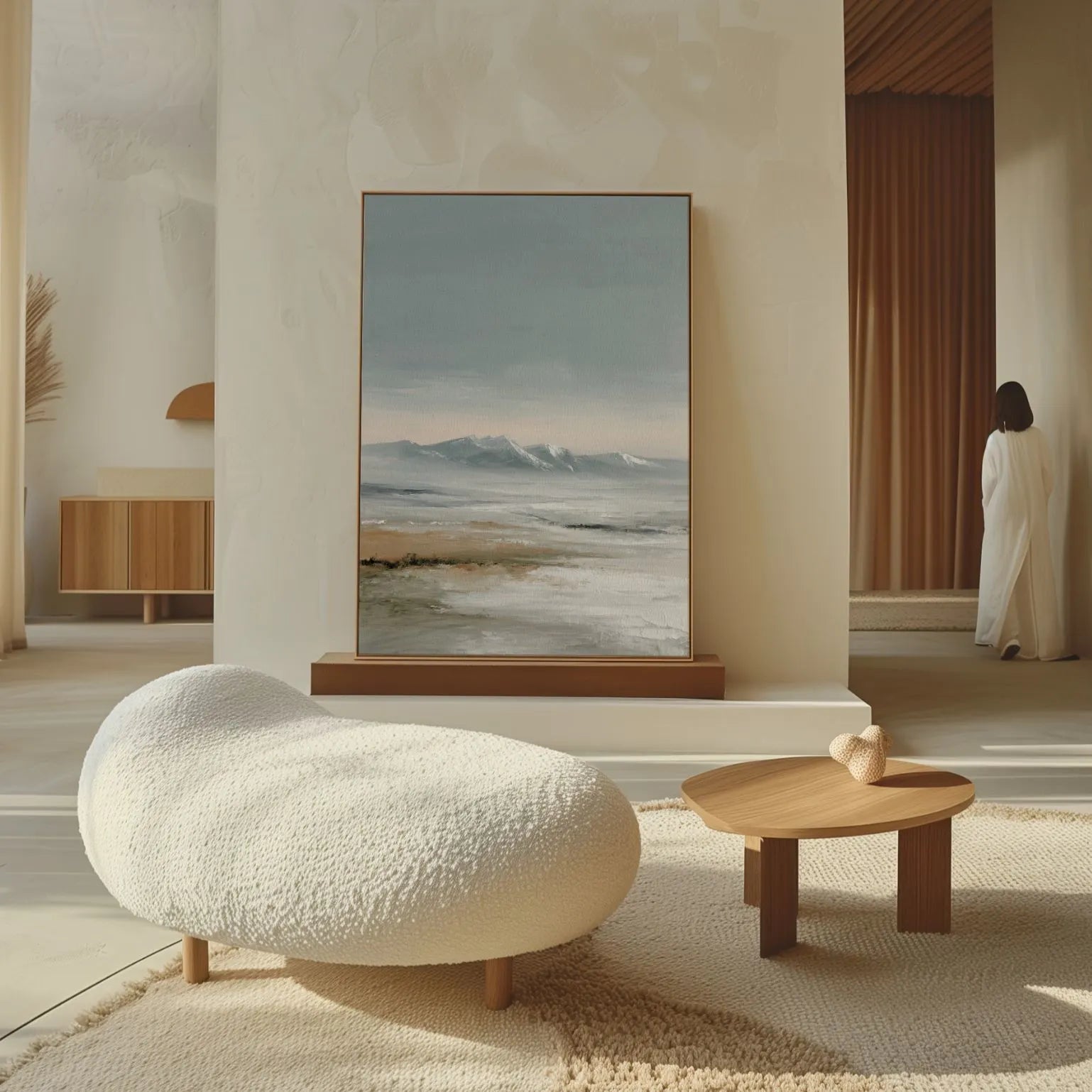 Obraz na płótnie w ramie doskonale pasuje do wnętrz japandi, scandi i nowoczesnych naturalnych, tworząc atmosferę ciszy i równowagi.