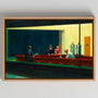Ten obraz na płótnie w ramie przedstawia „Nighthawks” (1942), jedno z najważniejszych dzieł Edwarda Hoppera. Oświetlony bar, wyraziste kontrasty i oszczędna kolorystyka budują atmosferę miejskiej izolacji.