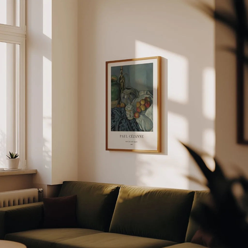 Plakat Paul Cézanne „Martwa natura z jabłkami” (1893) do klasycznego przykładu najwyższej klasy artysty, który na nowo zdefiniował sztukę martwej natury. W tej wersji Cézanne łączy geometrię struktury z subtelną grą światła i koloru. Jabłka, dzban i dekor tkanina pokrywająca harmonijną całość, której każdy element ma swoje miejsce i rytm. Głębia kolorystyczna i kontrast chłodnych odcieni niebieskiego z ciepłymi tonami owocowymi, wykonanie wyrafinowane, spokojny charakter.