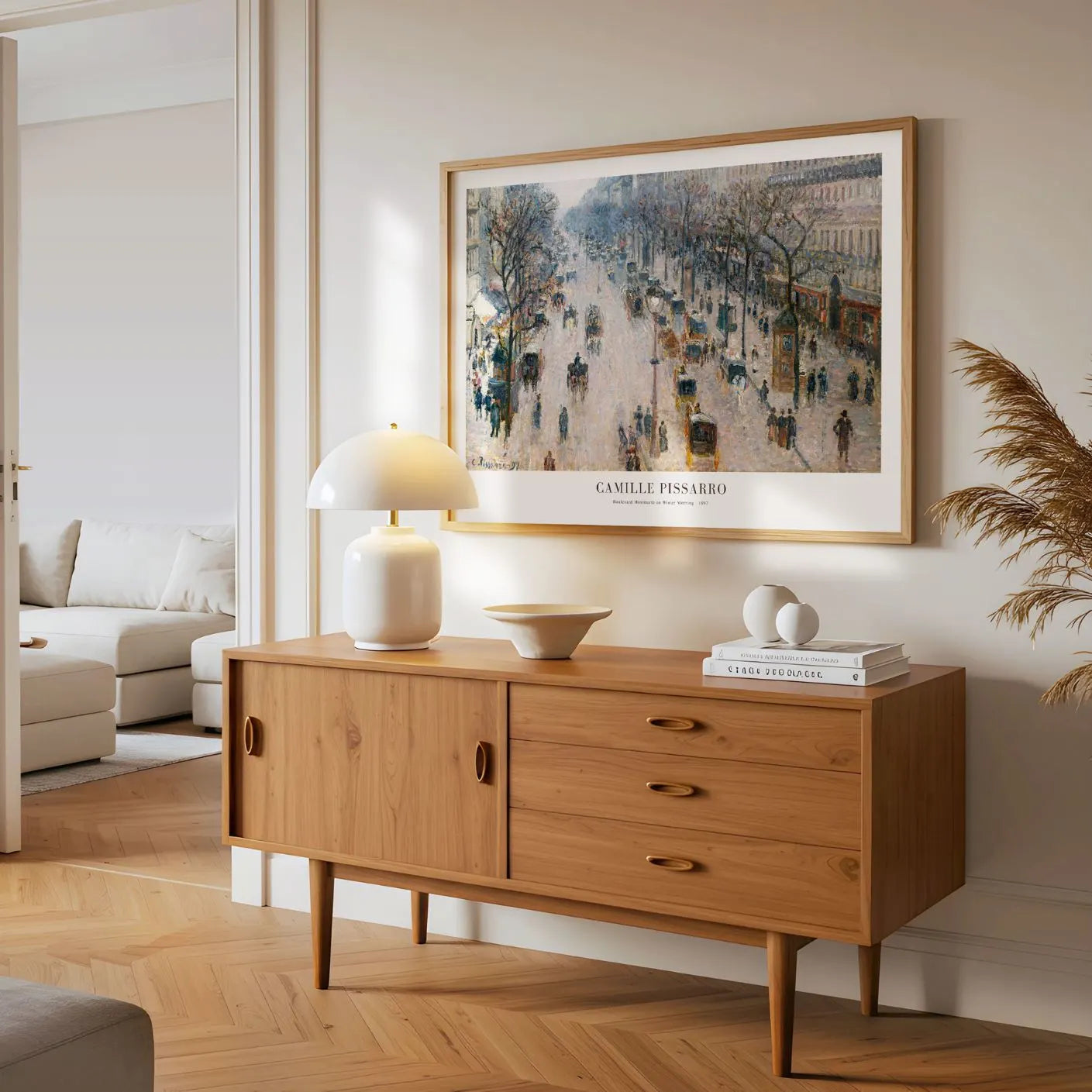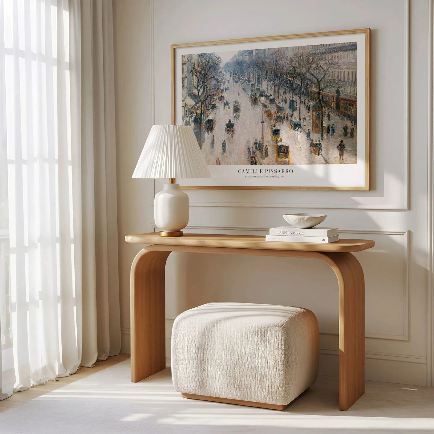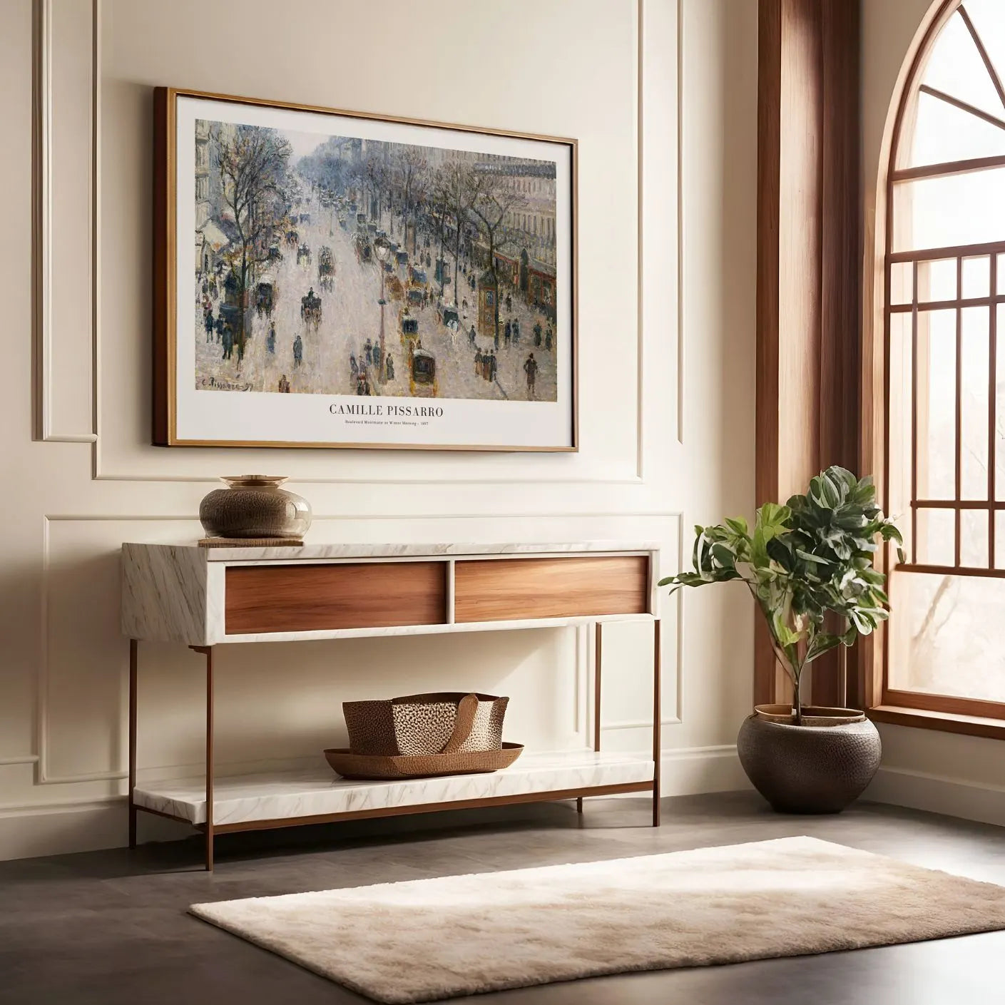 Plakat Camille Pissarro „Boulevard Montmartre on a Winter Morning” (1897) to reprodukcja, której artysta oddaje pulsujące życie Paryża do końca XIX wieku. Ulice pełne ludzi i powozów, miękkie światło zimowego poranka i charakterystyczna, rozedrgana faktura oparta na typowej dla impresjonizmu atmosfery ruchu i ulotności chwili.