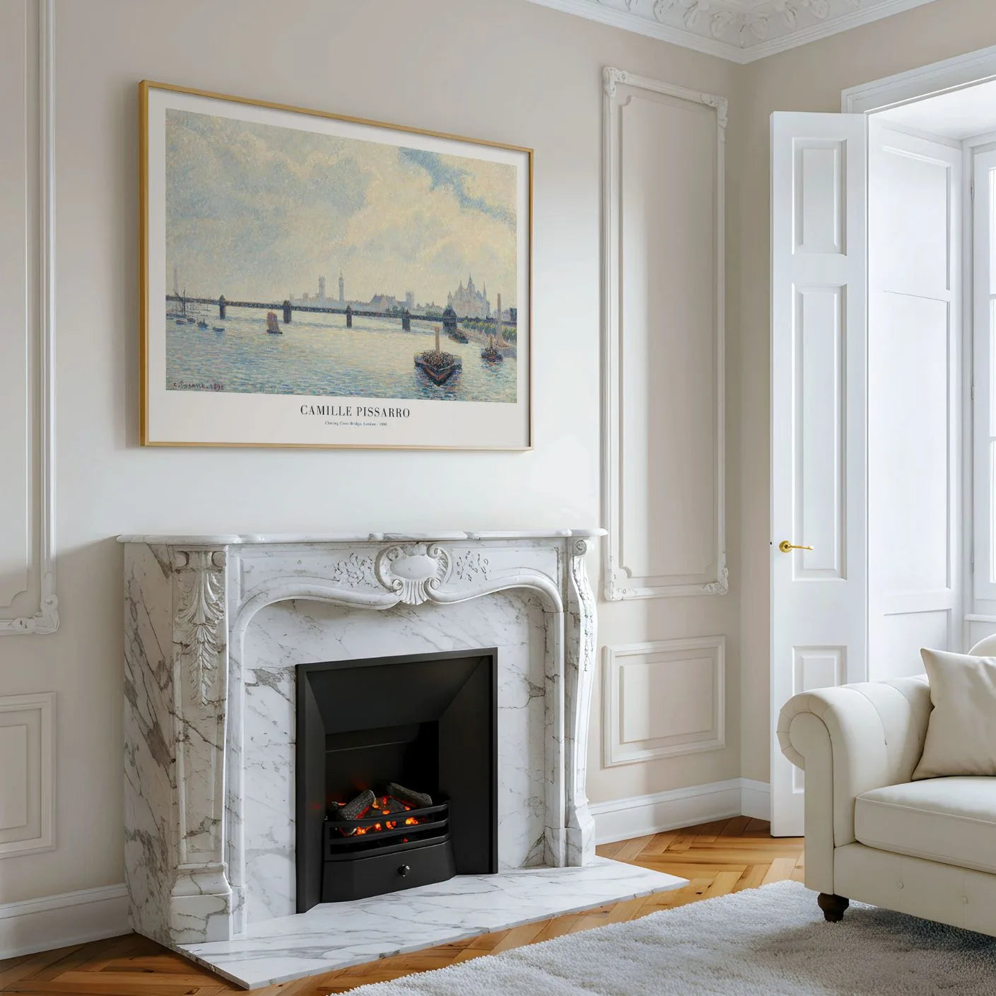 Plakat Camille Pissarro „Charing Cross Bridge, London” (1890) to subtelna i elegancka reprodukcja dzieła jednego z najwybitniejszych impresjonistów. Artysta uchwycił mglistą panoramę Londynu z mniejszą lekkością i poetyckim nastrojem. Delikatne światło i miękkie refleksy na wodzie znajdującej się w domu, ciszy i refleksji.