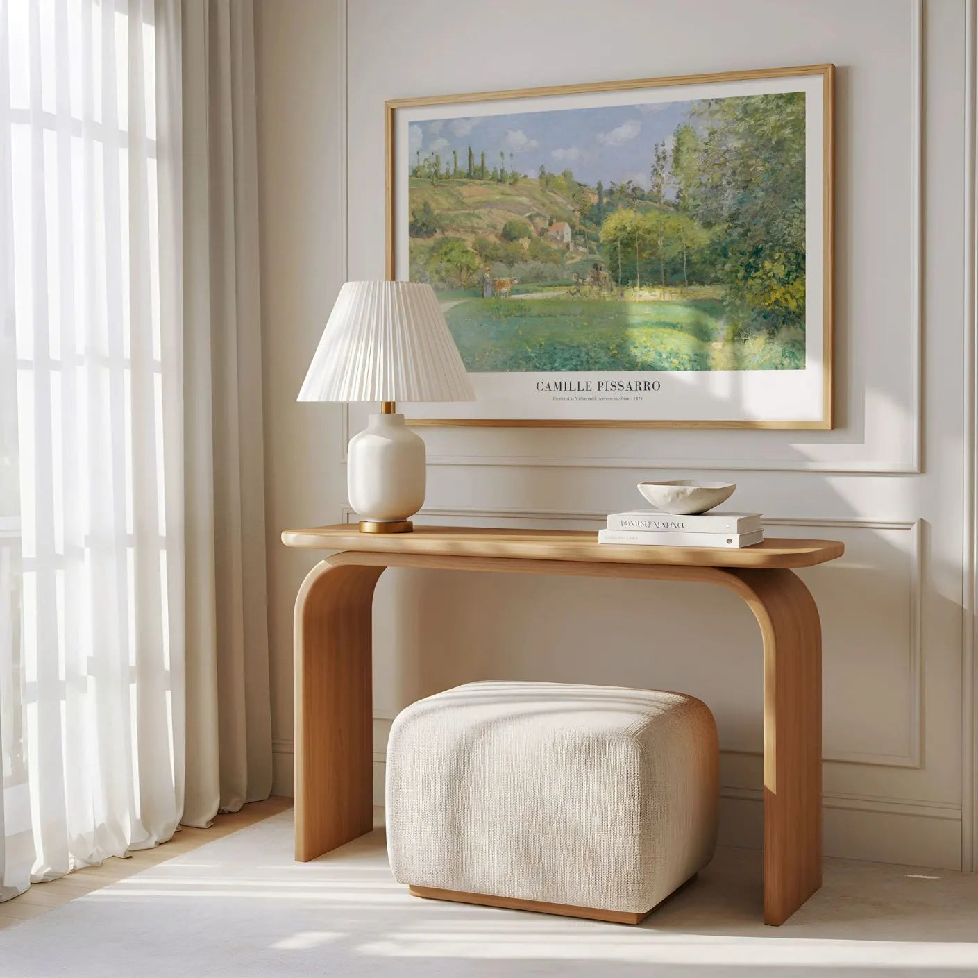 Plakat Camille Pissarro „Cowherd at Valhermeil, Auvers-sur-Oise” (1874) do reprodukcji jednego z pejzaży impresjonistycznych. Artysta uchwycił harmonię natury i codzienność życia wiejskiego w delikatnych, pastelowych tonach, pełnych światłach i powietrzu.