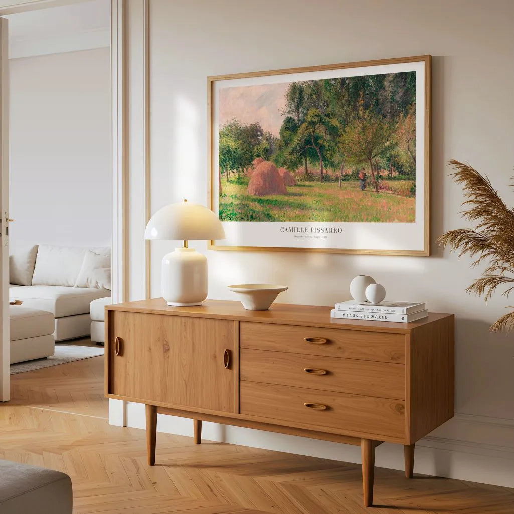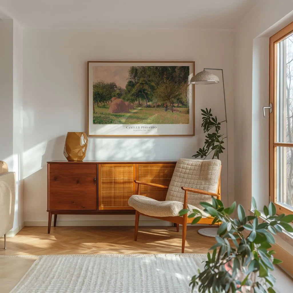 Plakat Camille Pissarro „Stóg siana, poranek, Eragny” (1899) do słynnej reprodukcji ludzkiej, ciepłej porynki i spokoju francuskiej wsi. Artysta w mistrzowski sposób oddaje światło, kolory i atmosferę życia w naturze — charakterystyczne dla jego dojrzałego późniejszego impresjonizmu. Widoczne snopy siana i gra świateł między drzewami wprowadzają harmonię, która koi zmysły i nadaje znaczenie naturze.