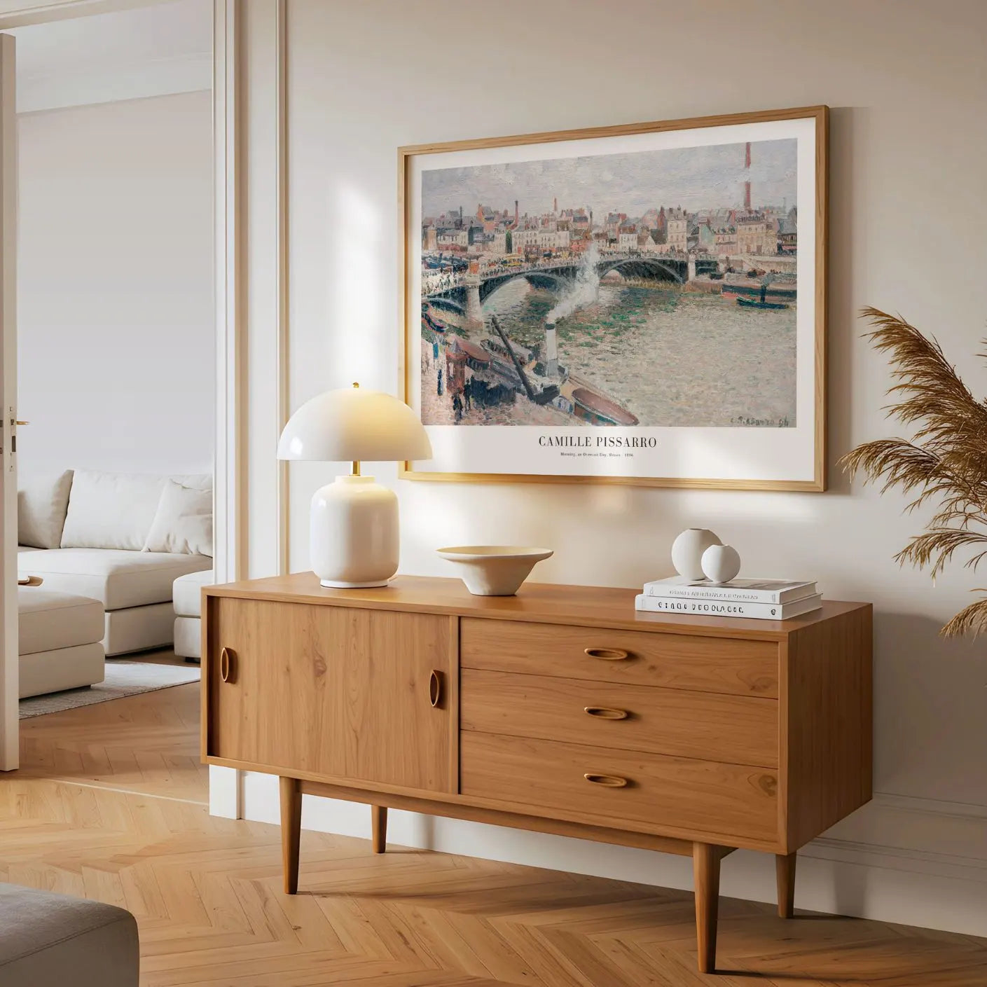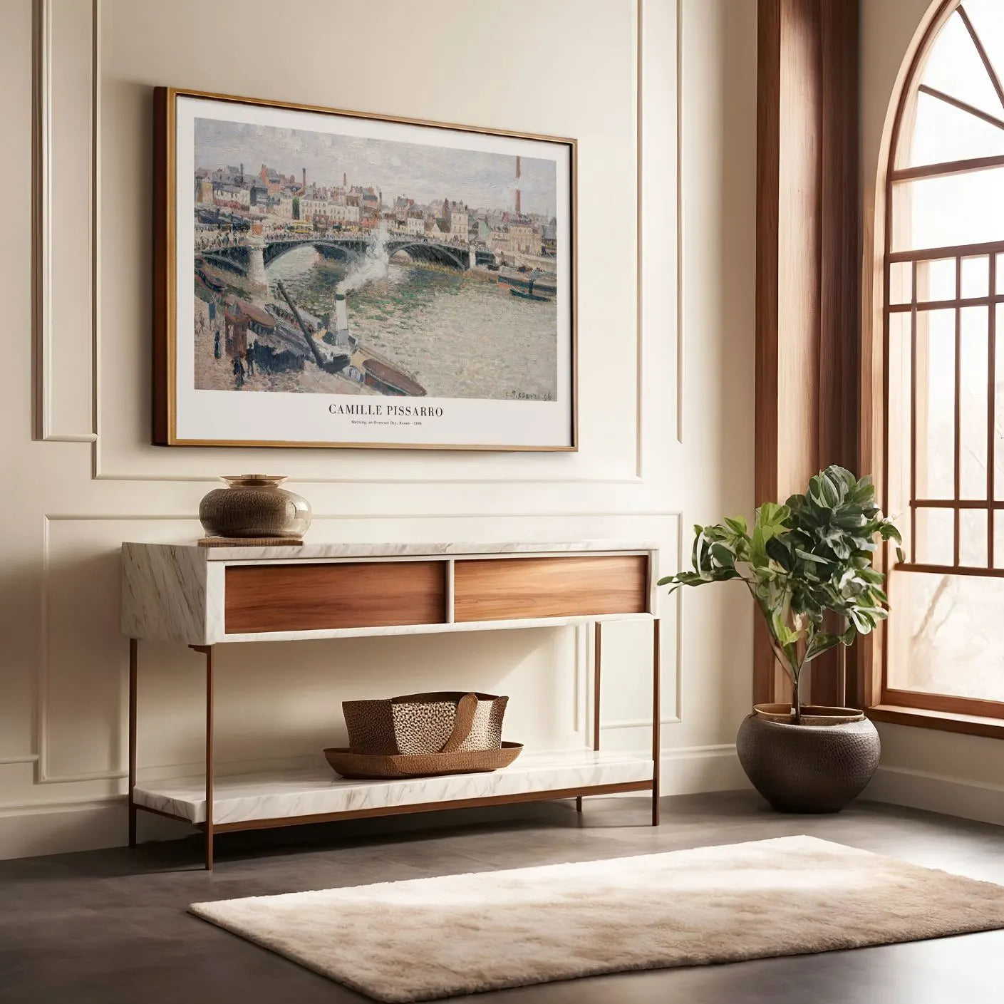 Plakat Camille Pissarro „Poranek, pochmurny dzień, Rouen” (1896) do mistrzowskiej reprodukcji jednej z nazw miejskich pejzaży w historii impresjonizmu. Artysta uchwycił francuskie miasto Rouen w delikatnym, rozpraszanym świetle poranka, tworząc kompozycję pełną spokoju, harmonii i miękkich refleksów na wodzie Sekwany.