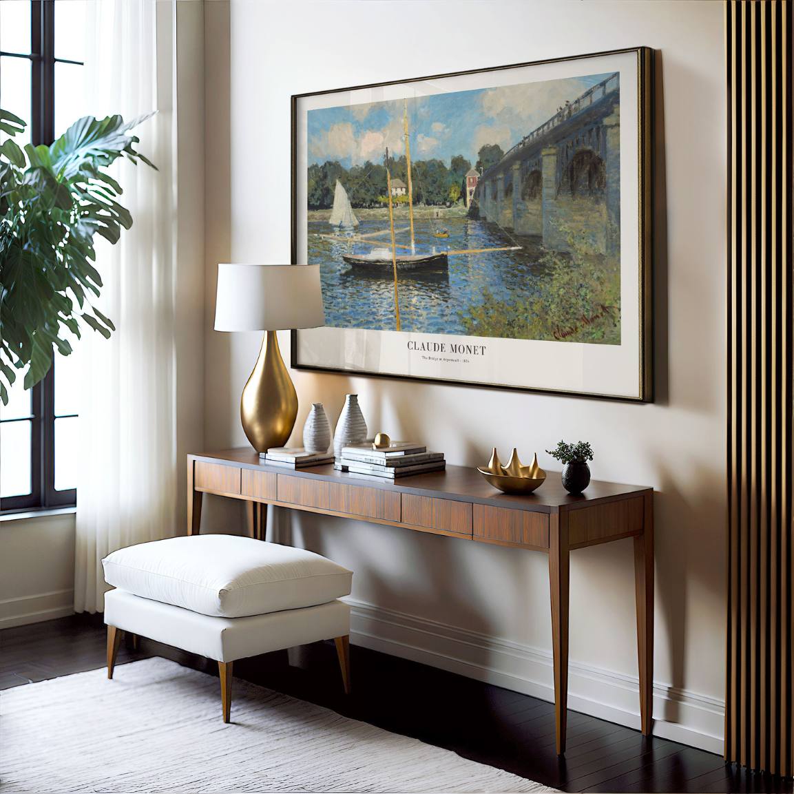 Ten plakat przedstawia „Most w Argenteuil” (1874) autorstwa Claude Monet – jedno z najbardziej rozpoznawalnych dzieł impresjonizmu francuskiego. Łodzie unoszą się na lśniącej Sekwanie, a niebo odbija się w delikatnych falach.