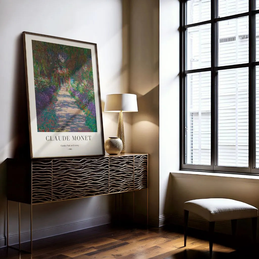 Ten plakat przedstawia „Ścieżka w ogrodzie w Giverny” autorstwa Claude Monet. Kręty szlak prowadzi wzrok przez gęste rabaty i liściastą zieleń, gdzie światło i cień miękko się przenikają, budując spokojną dynamikę.