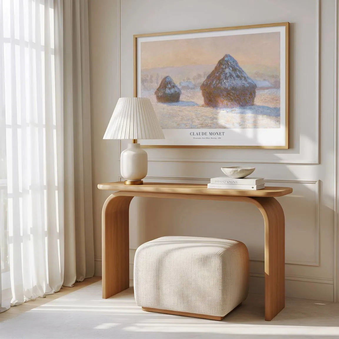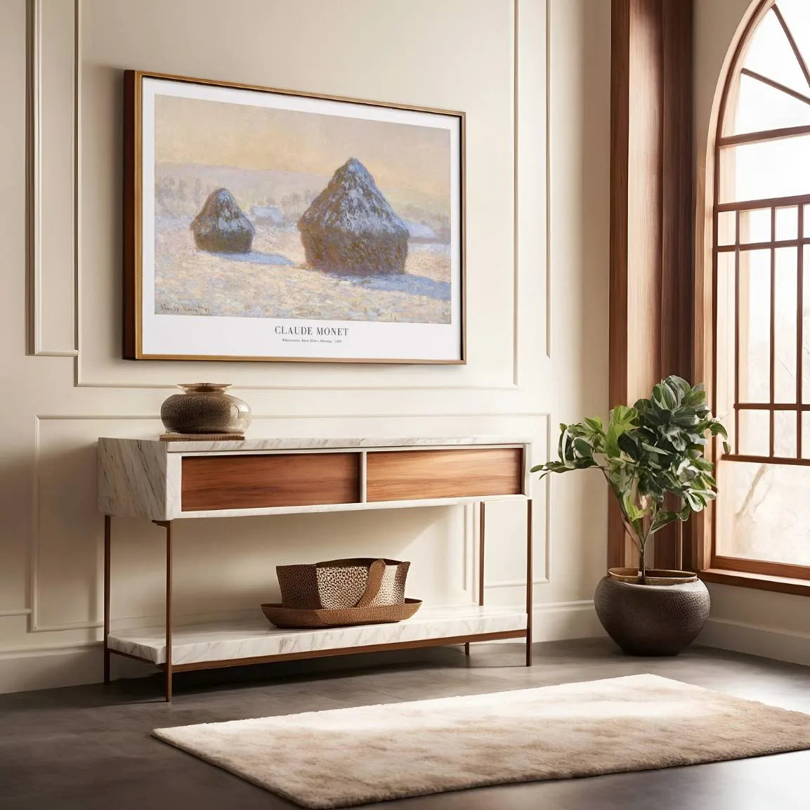 Ten plakat przedstawia „Stogi siana, efekt śniegu, poranek” (1891) autorstwa Claude Monet – dzieło z najsłynniejszego cyklu Stogów siana, w którym artysta badał, jak światło i atmosfera zmieniają ten sam krajobraz.