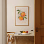 Ten elegancki plakat cytrusy wprowadza do wnętrza słoneczny klimat południowych Włoch. Ilustracja przedstawia dojrzałe pomarańcze i delikatne kwiaty inspirowane śródziemnomorskim krajobrazem.