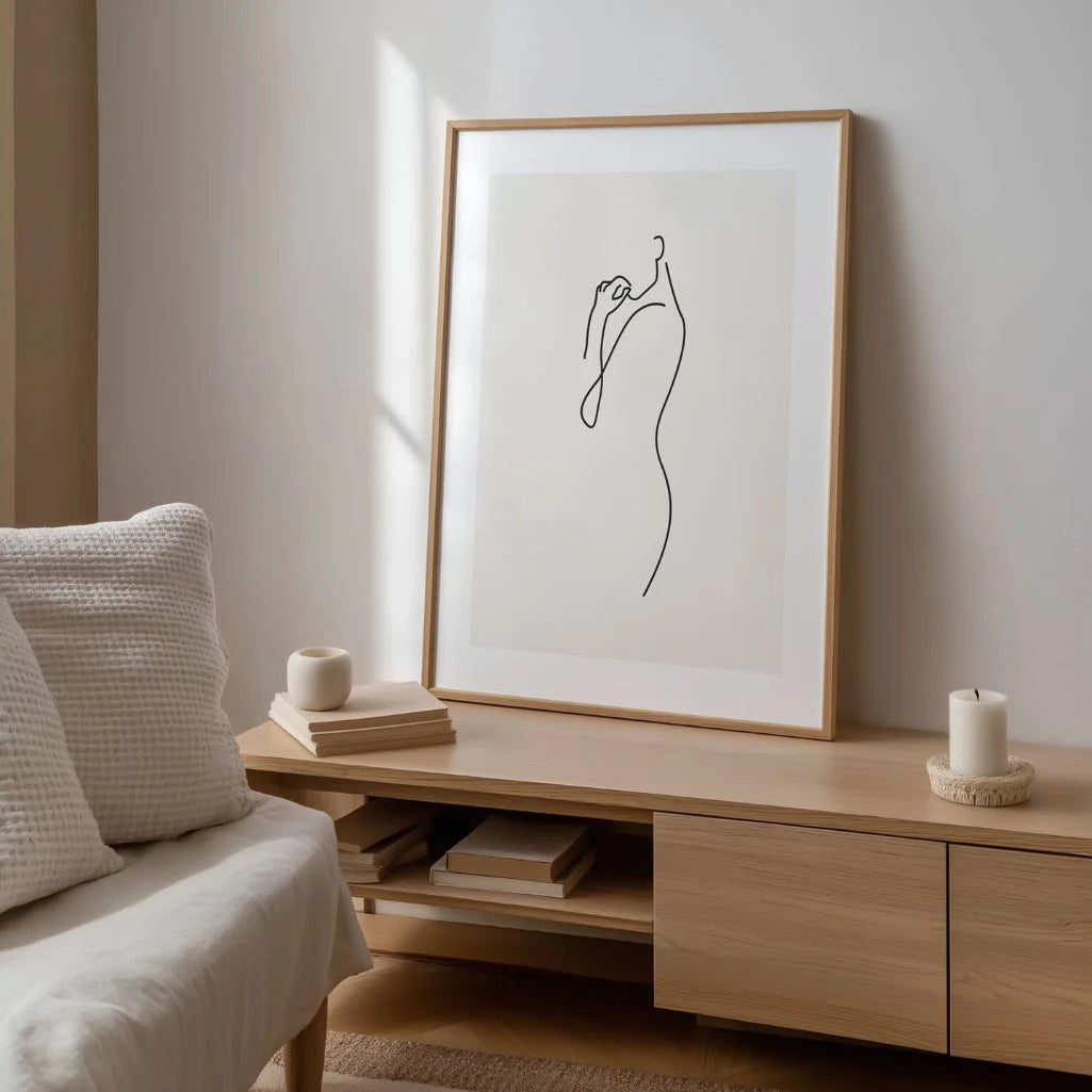 Neutralne beżowe tło dodaje ciepła, pozostając jednocześnie wyważone. Ten plakat Line Art doskonale pasuje do wnętrz skandynawskich, japandi, minimalistycznych i nowoczesnych, wprowadzając harmonię oraz ponadczasową elegancję.
