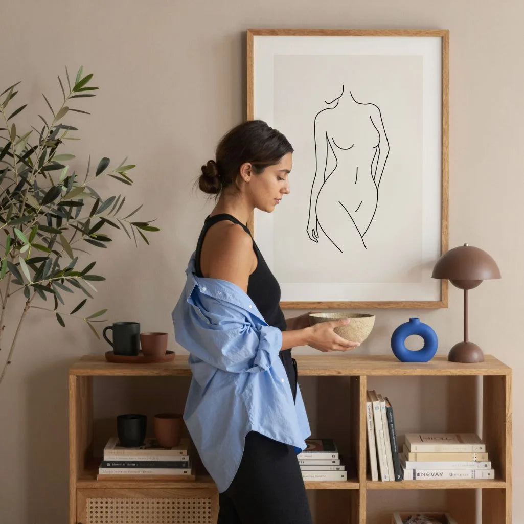 Minimalistyczna kompozycja jest nowoczesna, a jednocześnie ponadczasowa. Ten plakat Line Art doskonale pasuje do wnętrz minimalistycznych, skandynawskich, japandi oraz nowoczesnych, dodając im spokojnej elegancji.
