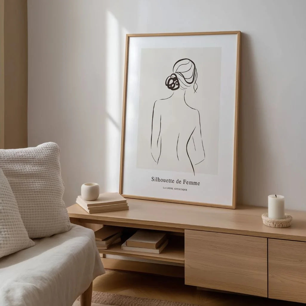 „Body Harmony” przedstawia kobiecą sylwetkę od tyłu, uchwyconą w czystej formie Line Art. Cienka czarna linia na jasnym tle podkreśla naturalne piękno i miękkość kształtów.