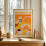 Ten plakat śniadaniowy przedstawia kolorową ilustrację z pieczywem, jajkami sadzonymi, croissantem, kawą i sokiem. Kompozycja tworzy ciepłą atmosferę idealnego poranka.