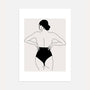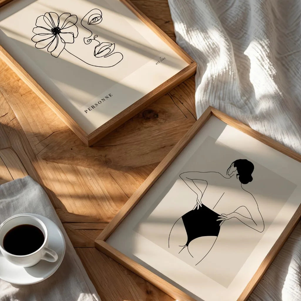Kobiece plecy przedstawiają sylwetkę widzianą od tyłu, narysowaną czystą linią w estetyce Line Art. Kontrast czerni i beżu tworzy harmonijną, minimalistyczną kompozycję.