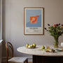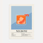 Ten stylowy plakat koktajlowy przedstawia minimalistyczną ilustrację klasycznego drinka Negroni z charakterystyczną skórką pomarańczy. Nowoczesna kompozycja i intensywna kolorystyka nadają grafice elegancki charakter inspirowany kulturą barową.