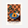 Ten plakat przedstawia połówkę papai umieszczoną w dekoracyjnej niebiesko-białej misce na malarskim tle w brązowo-beżową szachownicę. Gałązka z ciemnozielonymi liśćmi dodaje kompozycji naturalnej elegancji i równowagi.