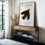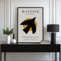 Ten plakat inspirowany twórczością Henriego Matisse’a przedstawia ekspresyjną czarną sylwetkę przypominającą ptaka, umieszczoną na tle złotego koła. W duchu papierowych wycinanek minimalistyczna kompozycja łączy prostotę z mocną formą, dodając wnętrzu elegancji i wyrazistego artystycznego charakteru. Druk na matowym papierze premium zapewnia wyraźny kontrast i szlachetne wykończenie. Dekoracja doskonale pasuje do wnętrz japandi, nowoczesnej klasyki i skandynawskich, wprowadzając harmonię i atmosferę nowoczesnej sztuki do salonu, sypialni i biura.