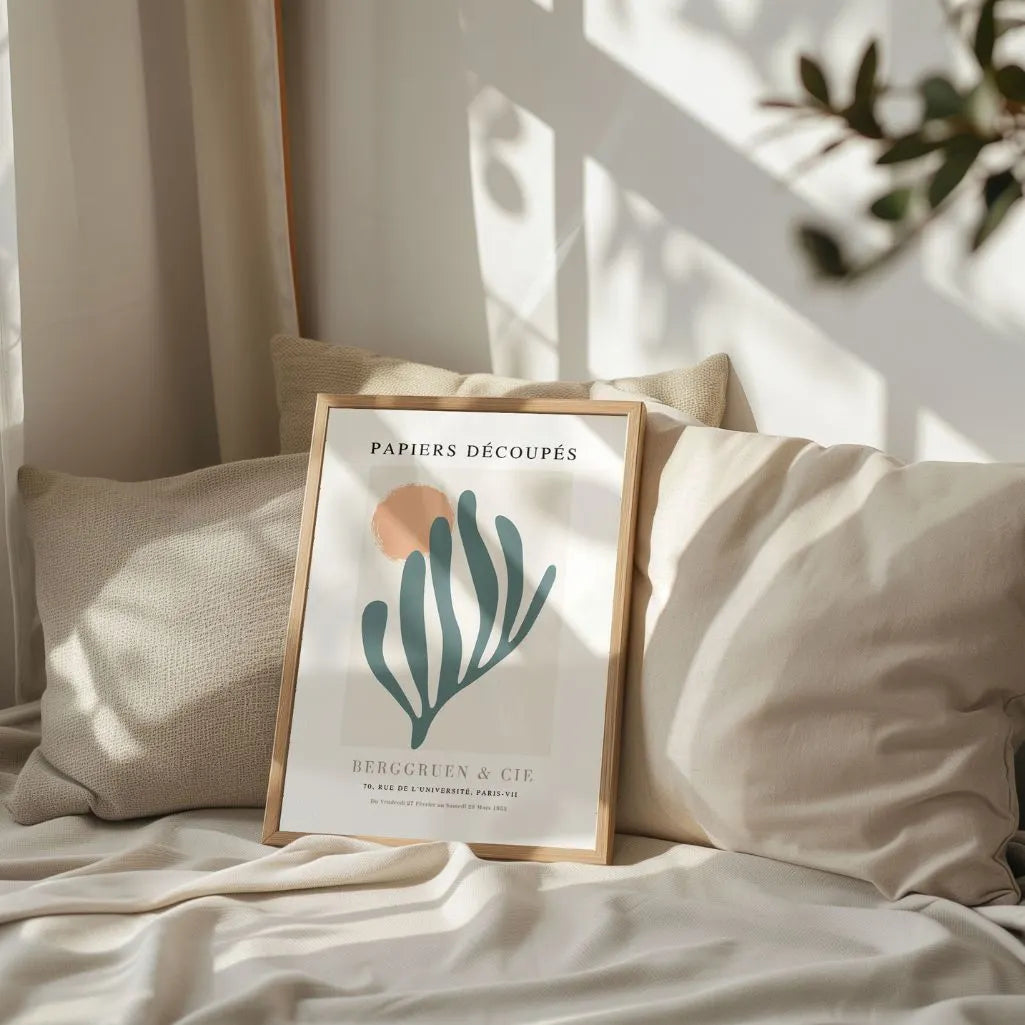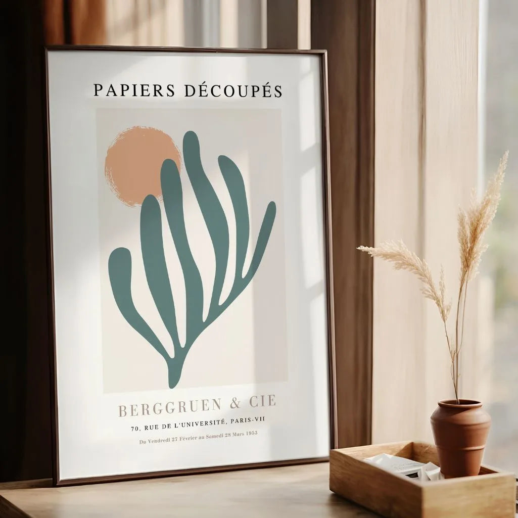 Ten stylowy plakat inspirowany twórczością Henriego Matisse’a przedstawia abstrakcyjną zieloną gałąź na ciepłym beżowym tle, dopełnioną słonecznym akcentem w formie koła. W duchu papierowych wycinanek kompozycja łączy proste kształty z harmonijnym kolorem, wnosząc spokojną elegancję i delikatnie podnoszący na duchu nastrój. Idealny do wnętrz boho, japandi, nowoczesnych i skandynawskich — dodaje wyrafinowanego artystycznego akcentu bez przytłoczenia. Druk na matowym papierze premium zapewnia miękkie, „galeryjne” wykończenie. Dostępny w ramie lub bez.