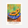 Ten plakat przedstawia soczyste kawałki papai podane w dekoracyjnej niebiesko-białej misce z orientalnym wzorem. Intensywne kolory owocu kontrastują z zielono-żółtym tłem, tworząc energetyczną tropikalną kompozycję.