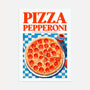 Ten plakat przedstawia klasyczną pizzę pepperoni na tle niebiesko-białej kratki, tworząc nowoczesny, lekko nostalgiczny klimat.