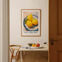 Ten elegancki plakat cytryny przedstawia soczyste cytrusy ułożone na dekoracyjnym talerzu inspirowanym estetyką śródziemnomorską. Ciepłe kolory i malarski styl wprowadzają do wnętrza światło, świeżość i klimat południowej Europy.