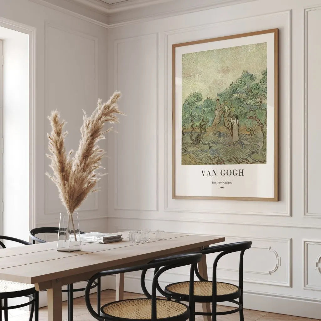 Ten plakat przedstawia „Gaj oliwny” autorstwa Vincent van Gogh w formacie pionowym. Oliwki Prowansji kołyszą się w łagodnym świetle, a drobne postacie pracujące są subtelnie wpisane w krajobraz.