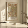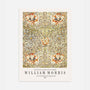 Plakat przedstawia „Honeysuckle” (1886) Williama Morrisa – bogaty wzór botaniczny z wijącymi się liśćmi i rozkwitającymi kwiatami.
