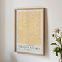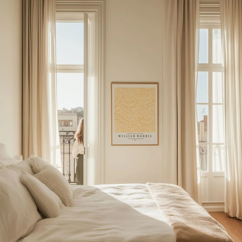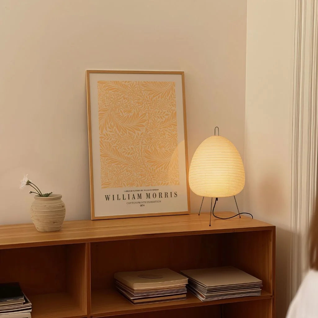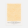 Plakat przedstawia „Larkspur” Williama Morrisa w słonecznej żółtej wersji. Gęsty wzór botaniczny z liśćmi i kwiatami tworzy harmonijny, dekoracyjny rytm.
