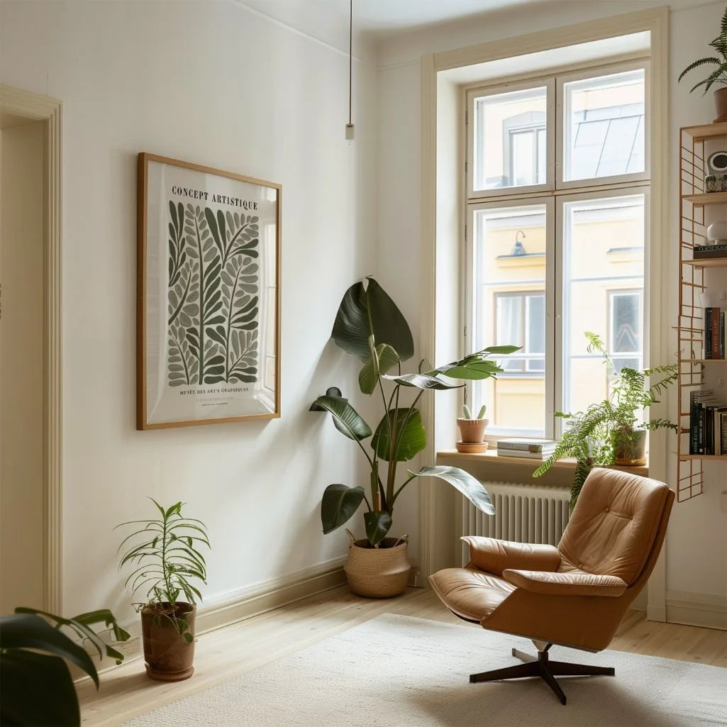 Stylowy plakat botaniczny z dekoracyjnymi figurami w odcieniach zieleni na jasnym tle. Graficzna kompozycja inspirowana estetyką retro i francuską stylem galeria doskonale uzupełnia wnętrza skandynawskie, japandi, boho oraz nowoczesne. To spokojna, harmonijna dekoracja na ścianę do salonu, sypialni lub biura — idealna solo albo jako część zestawu.