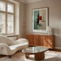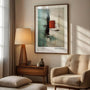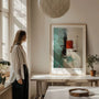 Ten plakat inspirowany Markiem Rothko pokazuje siłę prostoty. Duże turkusowe pole barwne zestawione jest z wyrazistym czerwonym akcentem, tworząc kontrast, który przyciąga wzrok, a jednocześnie pozostaje harmonijny i spokojny.
