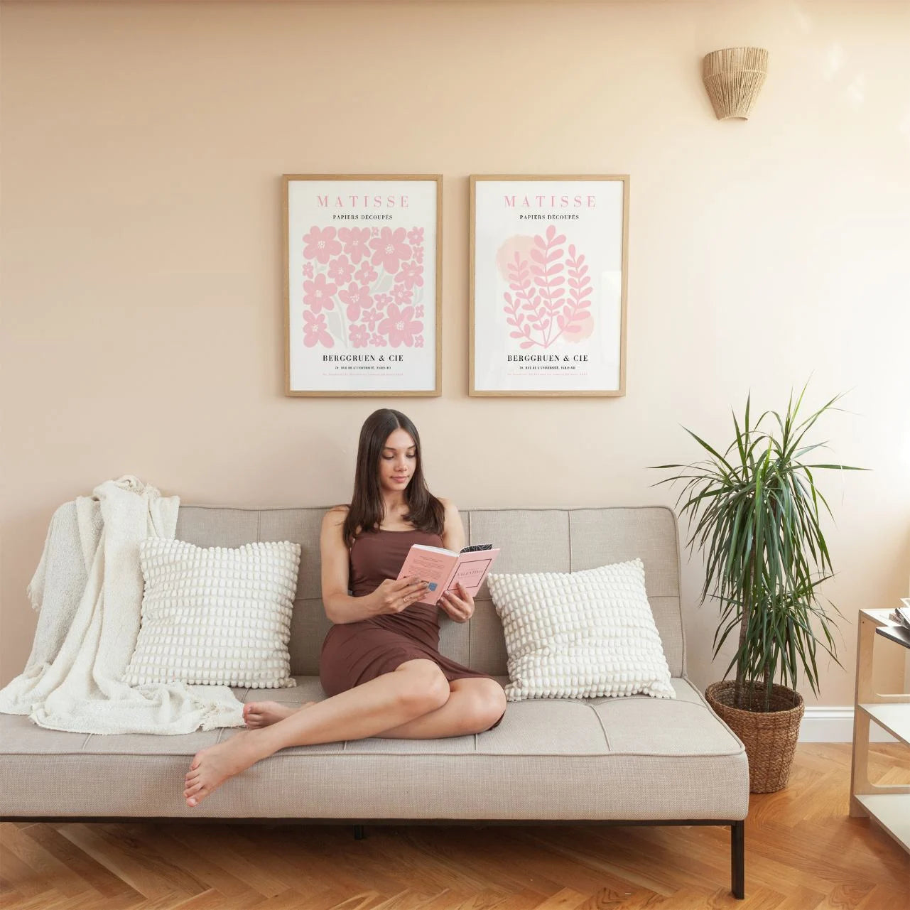 Zestaw 2 Plakatów Matisse – Pastelowe Kwiatowe Kompozycje przedstawiające propozycje dla osób, które cenią subtelność, chronią estetykę i inspirację natury. Delikatne różowe odcienie, miękkie kontury oraz florystyczne motywy nawiązują do lekkiego, poetyckiego stylu Henri Matisse'a, tworzącego atmosferę harmonii i spokoju. Plakaty pięknie prezentują się w jasnych wnętrzach, szczególnie w aranżacjach scandi, boho oraz modern classic. Dzięki pastelowej kolorystyce wprowadzają do przestrzeni świeżość, lekkość i wiosenny nastrój. Sprawdzona została w zestawie, sypialnia, garderoba, a także jako elegancka dekoracja pokoju dziewczynki. To proponowane rozwiązanie dla rozwiązania awaryjnego z nutą ochronną, artystycznego.