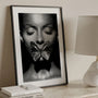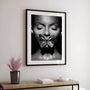 Ten plakat przedstawia portret kobiety o zamkniętych oczach, połyskującymi drobinkami, z metalicznym motylem, który pojawia się. Kompozycja wykorzystuje silny kontrast czerni i srebra, tworząc obraz pełen symboliki, tajemnicy i wyrazistego artystycznego charakteru. To idealna dekoracja wnętrz, glamour, loftowych oraz minimalistycznych – wprowadza dramatyzm, elegancję i wyjątkowy, galeryjny styl.