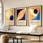 Połączenie połączenia pomarańczowego i kremu z głębokim granatem oraz akcentem błękitu nadaje plakatom energetyczny, a jednocześnie wyważony charakter. Zestaw wprowadza do wnętrza lekkość, rytm i wizualność świeżości, dystrybucjonowaną estetykę.