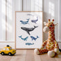 Akwarelowy plakat edukacyjny z wielorybami w chłodnych odcieniach błękitu i granatu do pięknych obrazów do pokoju dziecka, które wprowadzają spokój i morski klimat. Zestaw ilustracji przedstawia różne gatunki wielorybów i doskonale nadaje się do konfiguracji w stylu oceanicznym, skandynawskim i minimalistycznym. Idealny do pokoju niemowlaka, przedszkolaka lub małego miłośnika przyrody — jako dekoracja nad łóżkiem, biurkiem albo w wyposażeniu do czytania. To także nowy pomysł na prezent: urodziny, baby shower, święta czy pokój dziecka.