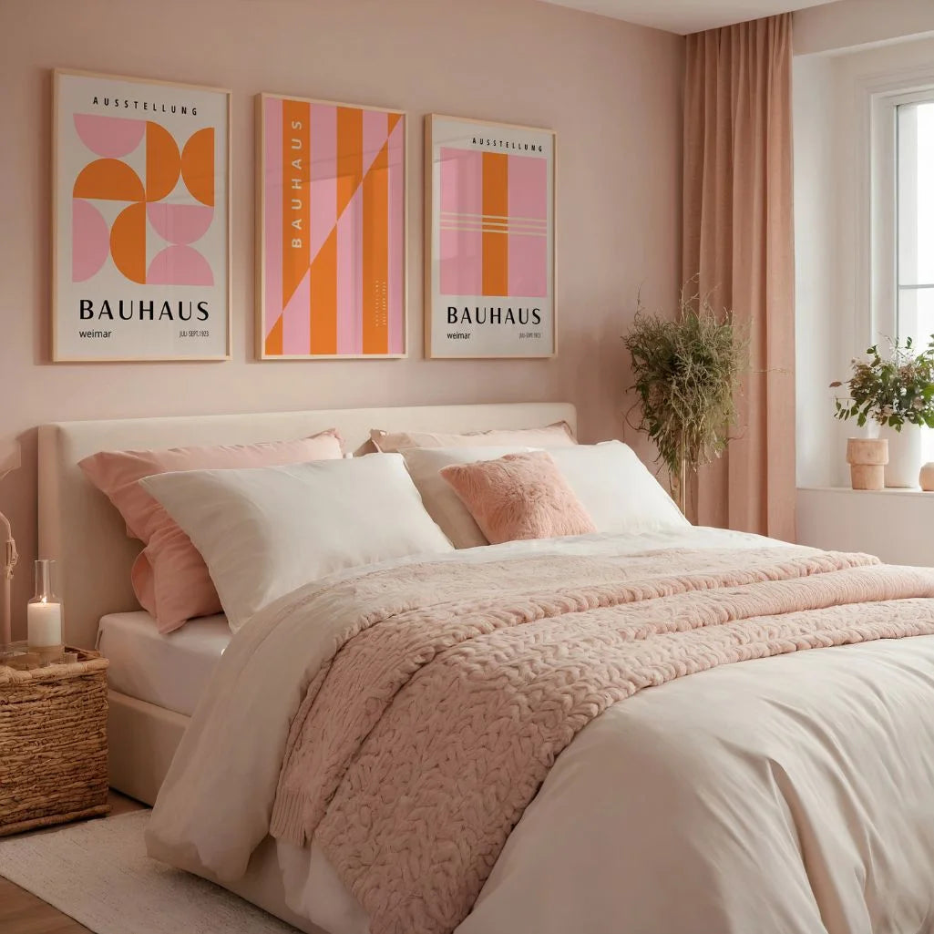 Plakaty Bauhaus – zestaw 3 sztuki „Energia Koloru Weimar” to wyrazista, dynamiczna interpretacja stylu Bauhaus, oparta na mocnym kontraście, dostępnygo różu i pomarańczowy. Geometryczne pasy, półokręgi oraz diagonalne linie zasilające, pełna energia kompozycji wizualnej.
