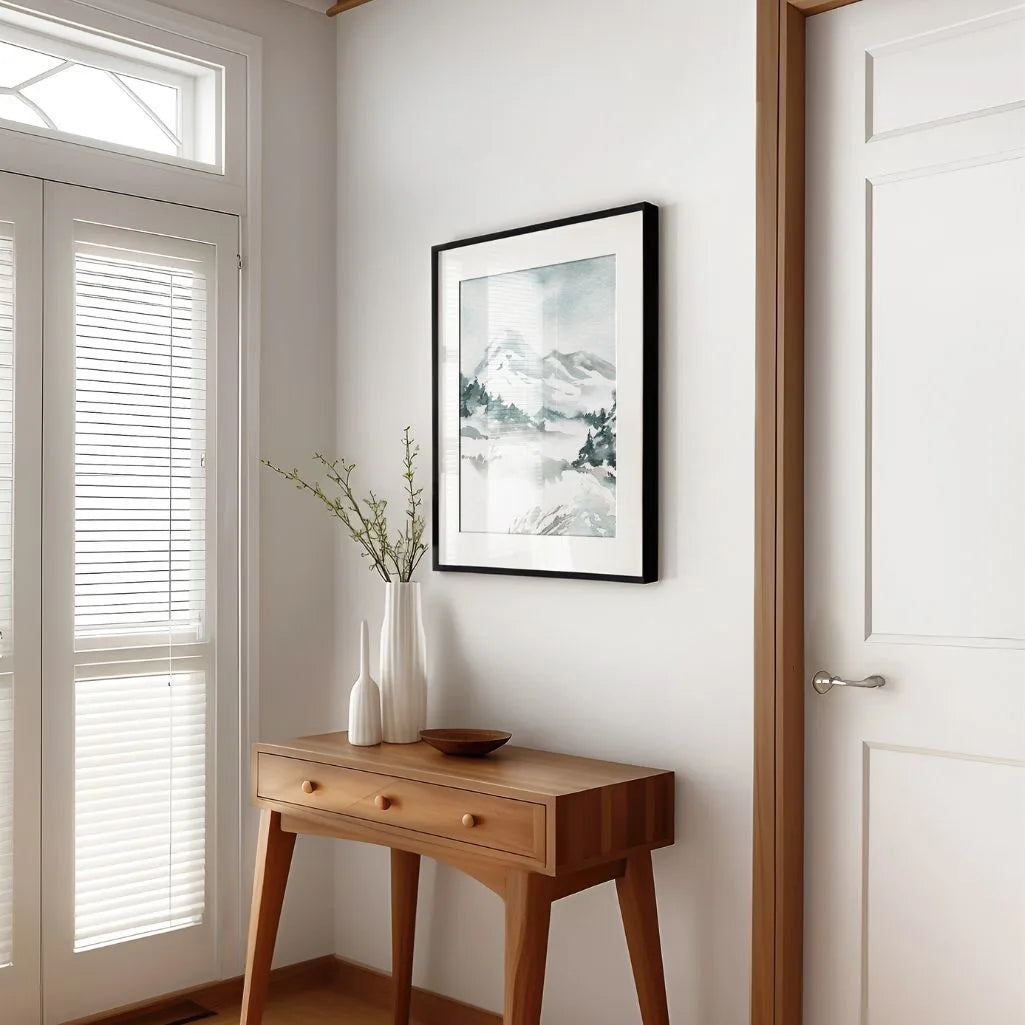 Plakat Zimowe Górskie Szczyty na akwarelową ilustrację przedstawiającą ośnieżone masywy górskie w otoczeniu zamarzniętych lasów i subtelnej, chłodnej mgły. Stonowana paleta szarości, błękitów i bieli tworzy atmosferę ciszy, spokoju i prawidłowych harmonii. Ten obraz doskonale wpisuje się we wnętrzu w stylu scandi, japandi, minimalnym oraz dodatkowym, wprowadzając do nich świeżość, lekkość i elegancję.