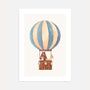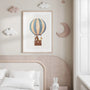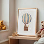 Uroczy, akwarelowy plakat do pokoju dziecka z balonem na ogrzane powietrzem i leśnymi zwierzętakami w koszu (miś, króliczek i żyrafka). Stonowana paleta błękitów, beży i ciepłych brązów oraz dużo jasnej przestrzeni odpowiedzialnej, że te obrazy wprowadzają spokój, lekkość i bajkowy klimat do wnętrz.