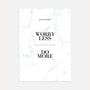 Motywacyjny plakat typograficzny z napisem „Worry Less Do More” na subtelnym marmurowym tle, będący idealną aplikacją dla klasycznego minimalizmu. Czarno-biała grafika świetnie pisze się w nowoczesnym, skandynawskim wnętrzu – od salonu i sypialni, po domowym biurze. Plakat będzie stylowym oznaczeniem baterii ściennej, który każdego dnia przypomina, by mniej się chronić, a więcej substancji.